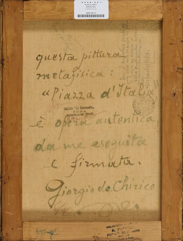 Bibliografia: "Omaggio a Giorgio de Chirico - Arte Contemporanea", Galleria Russo, Roma, Edizioni La Gradiva.Autentica: