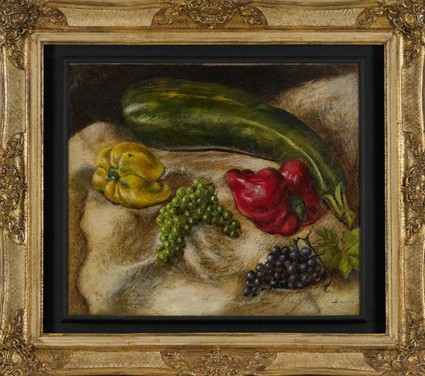 "Vita Silente, Giorgio de Chirico, dalla Metafisica al Barocco" Palazzo Liceo Saracco, Acqui Terme, 1997, pubblicato sul catalogo di mostra, pagg. 90-91 (illustrato, con titolo 'Natura morta [uva, ortaggi]', tecnica e data errate).