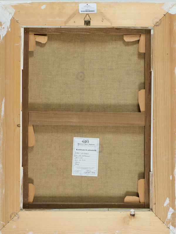 Sul verso: etichetta di autenticità e provenienza "Galleria d'Arte l'Androne", Scicli, con descrizione e timbri.