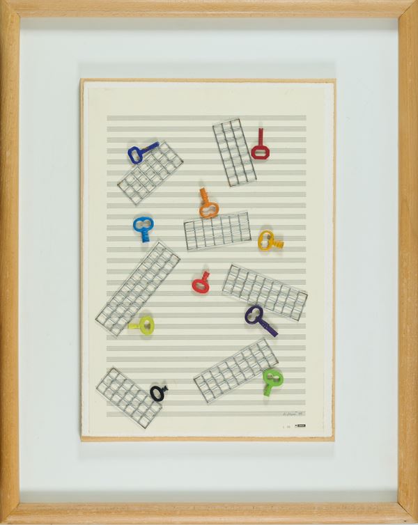 Accomulazione di oggetti su spartito musicale applicato su cartoncino applicato tavolaDimensioni: