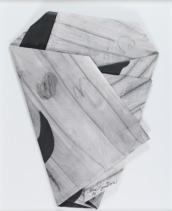 Tecnica mista su cartone piegato e sagomato, su tavola, cm. 30x30, Sul verso: firma e data.
