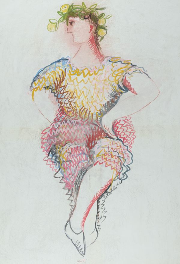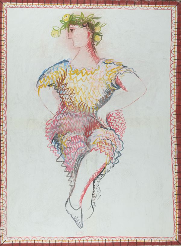 - " Reginetta delle mele ", Affresco su tela, cm. 160x120, firmato in basso al centro, sul verso: firma e titolo.