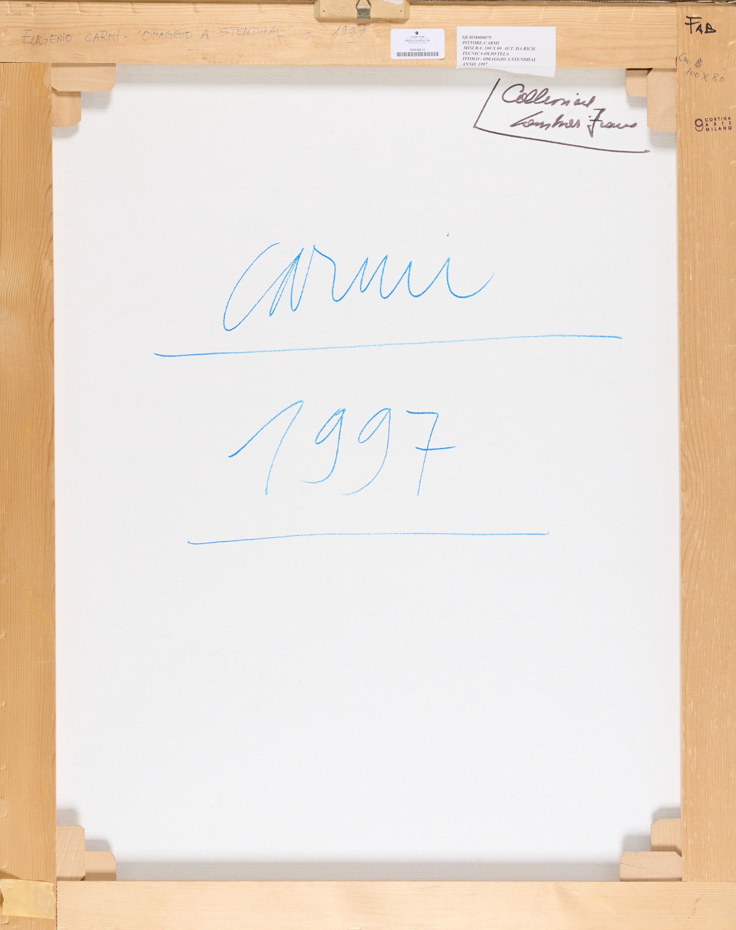 Timbro "Galleria Cortina Arte", Milano ed etichetta con descrizione.