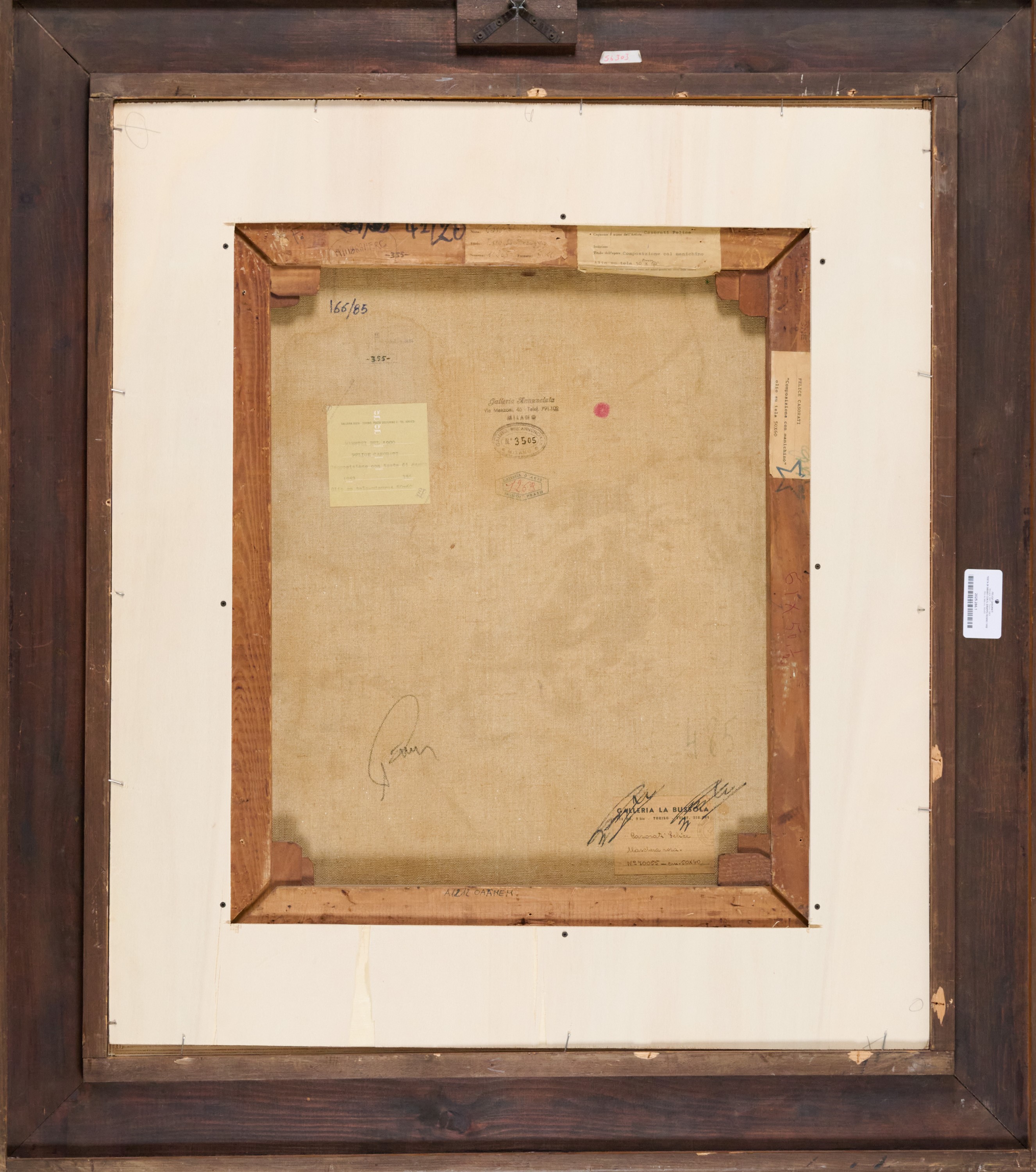 Sul verso: etichette Galleria d'Arte Cairola, Milano; Galleria d'Arte Medea, Cortina d'Ampezzo; Galleria Gissi, Torino; Galleria La Bussola, Torino.