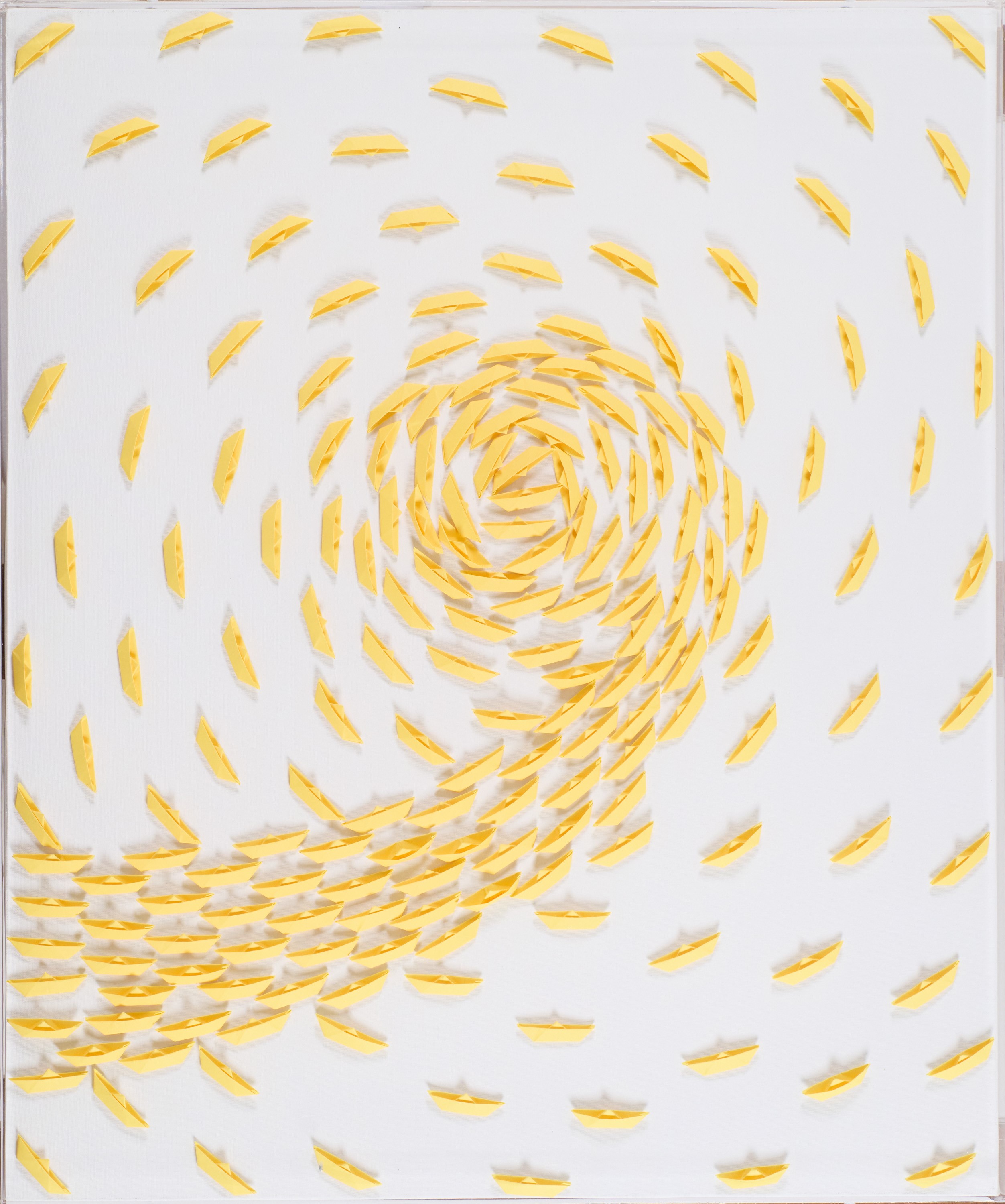 Barche di carta su tela in teca di plexiglasDimensioni: