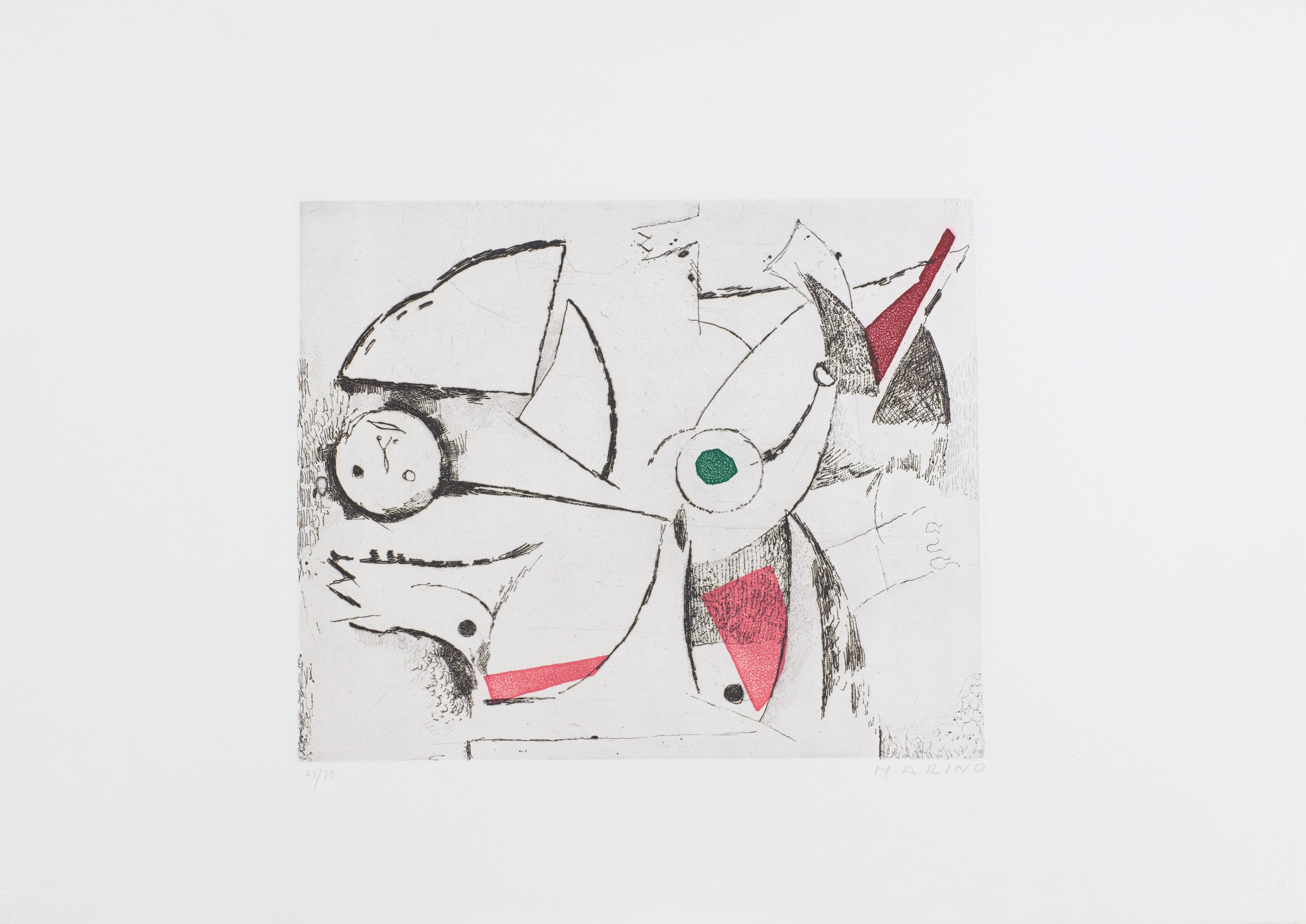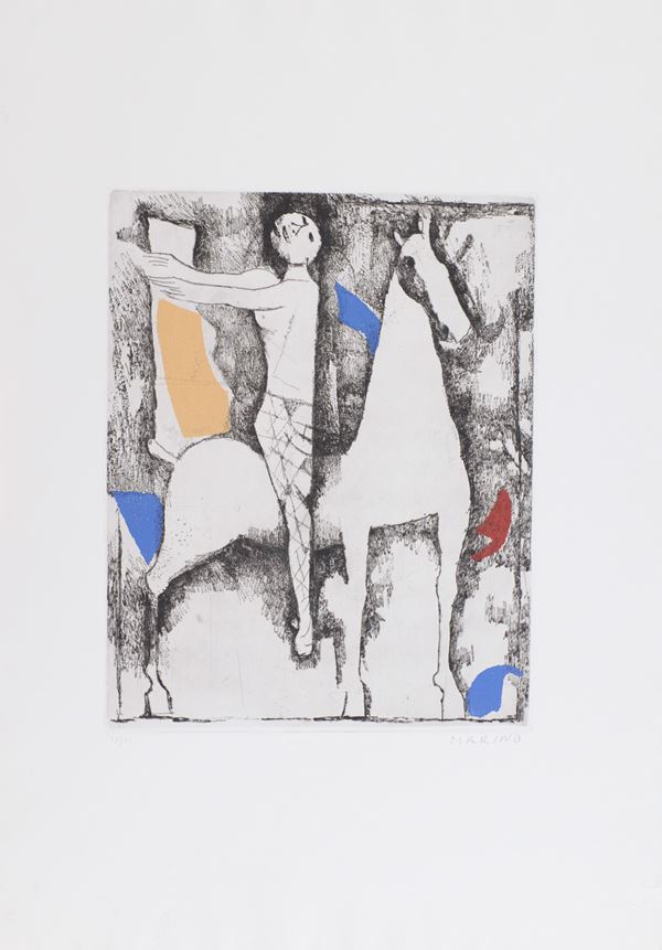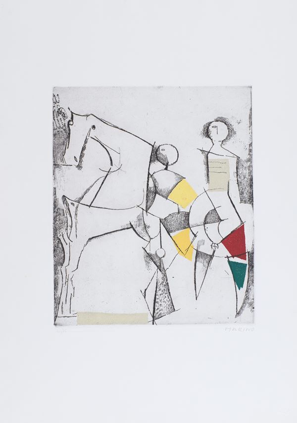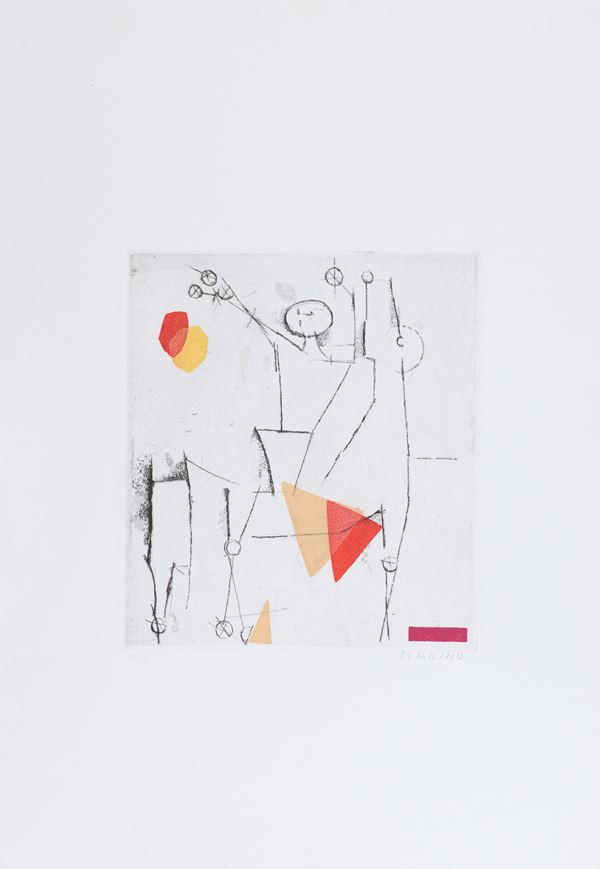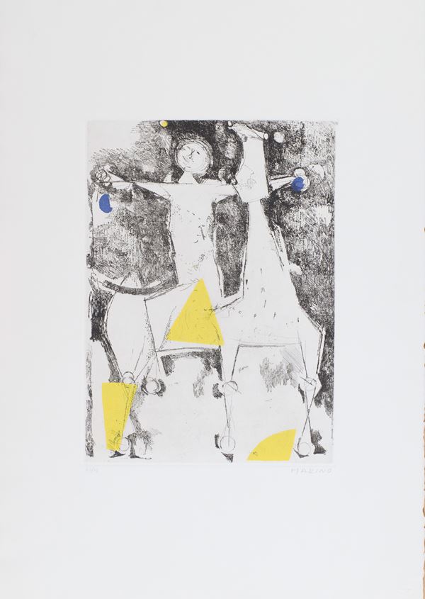 1) Gioco Perfetto, Puntasecca Acquatinta a 4 colori, Lastra cm 32x39. Firma e numerazione "Marino 63/75". Timbro a secco dello stampatore "Il cigno stamperia d'arte".
