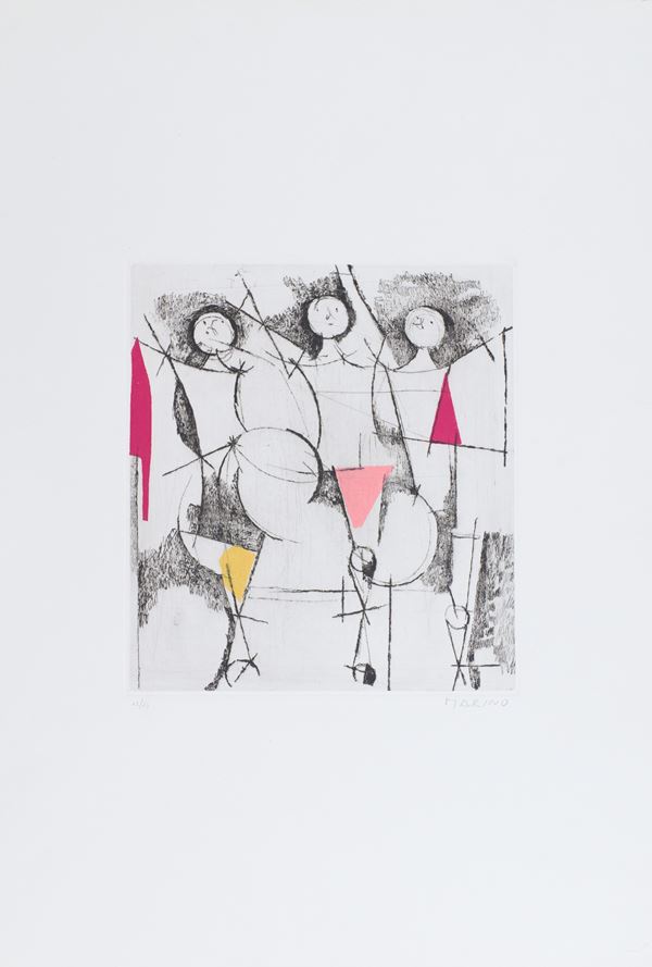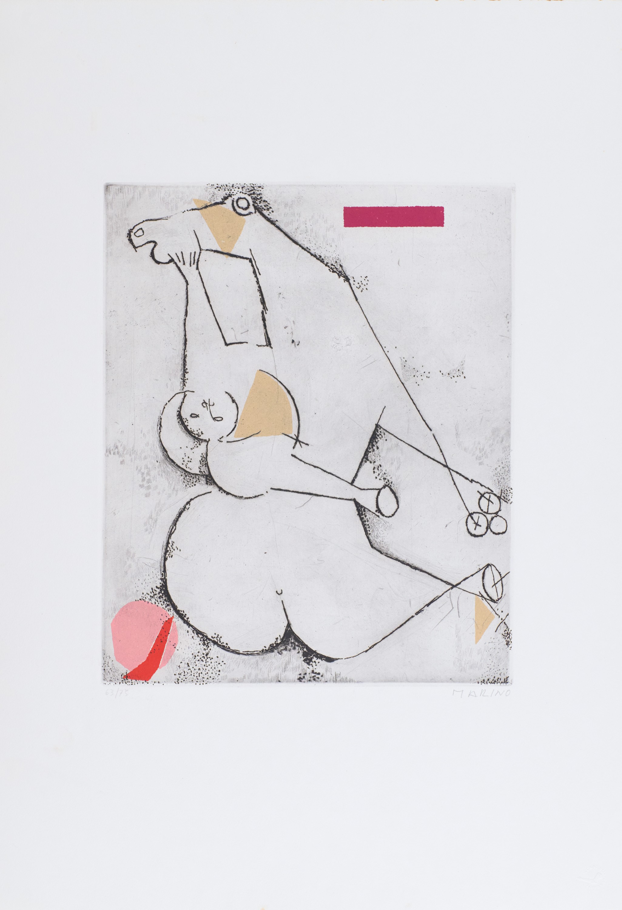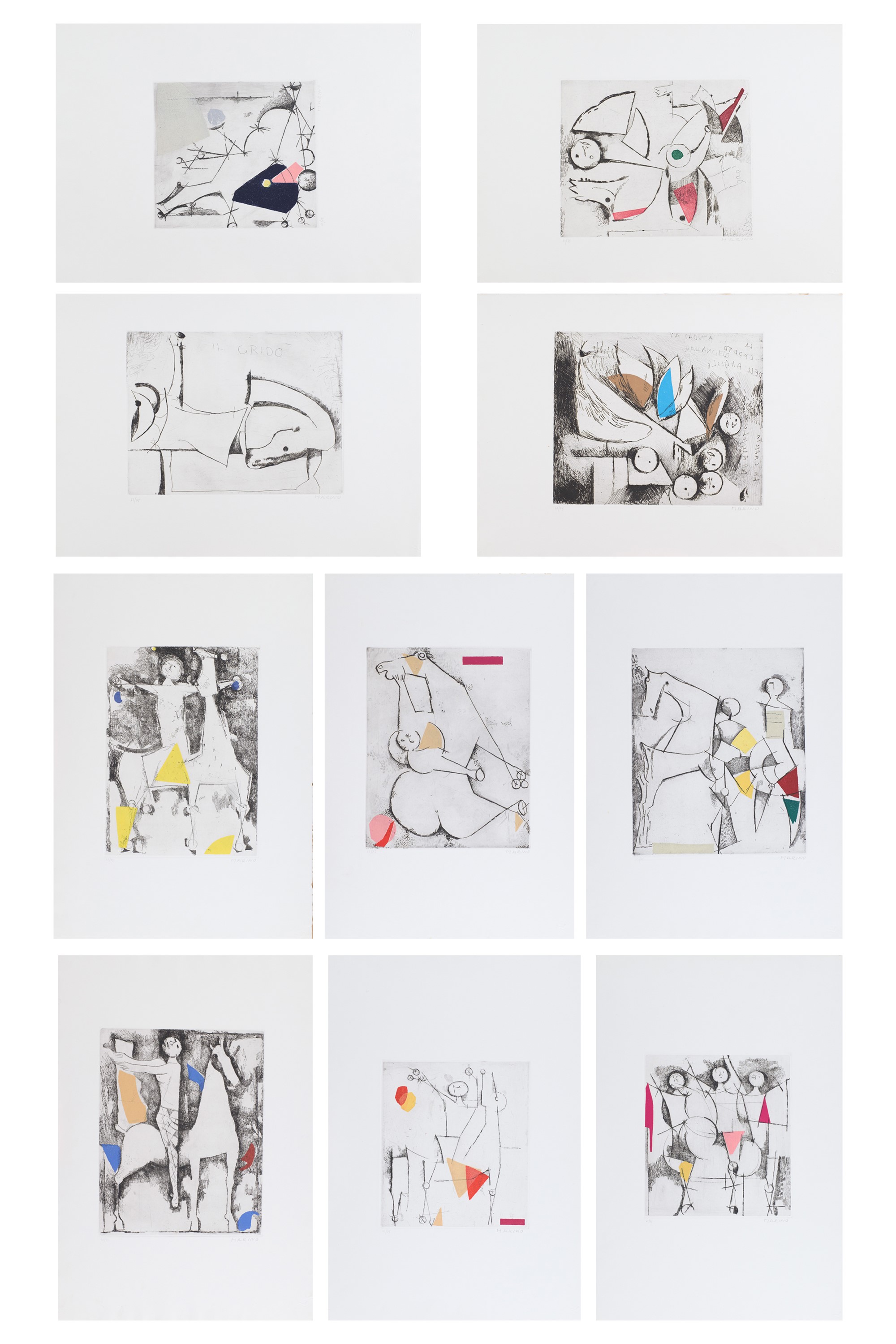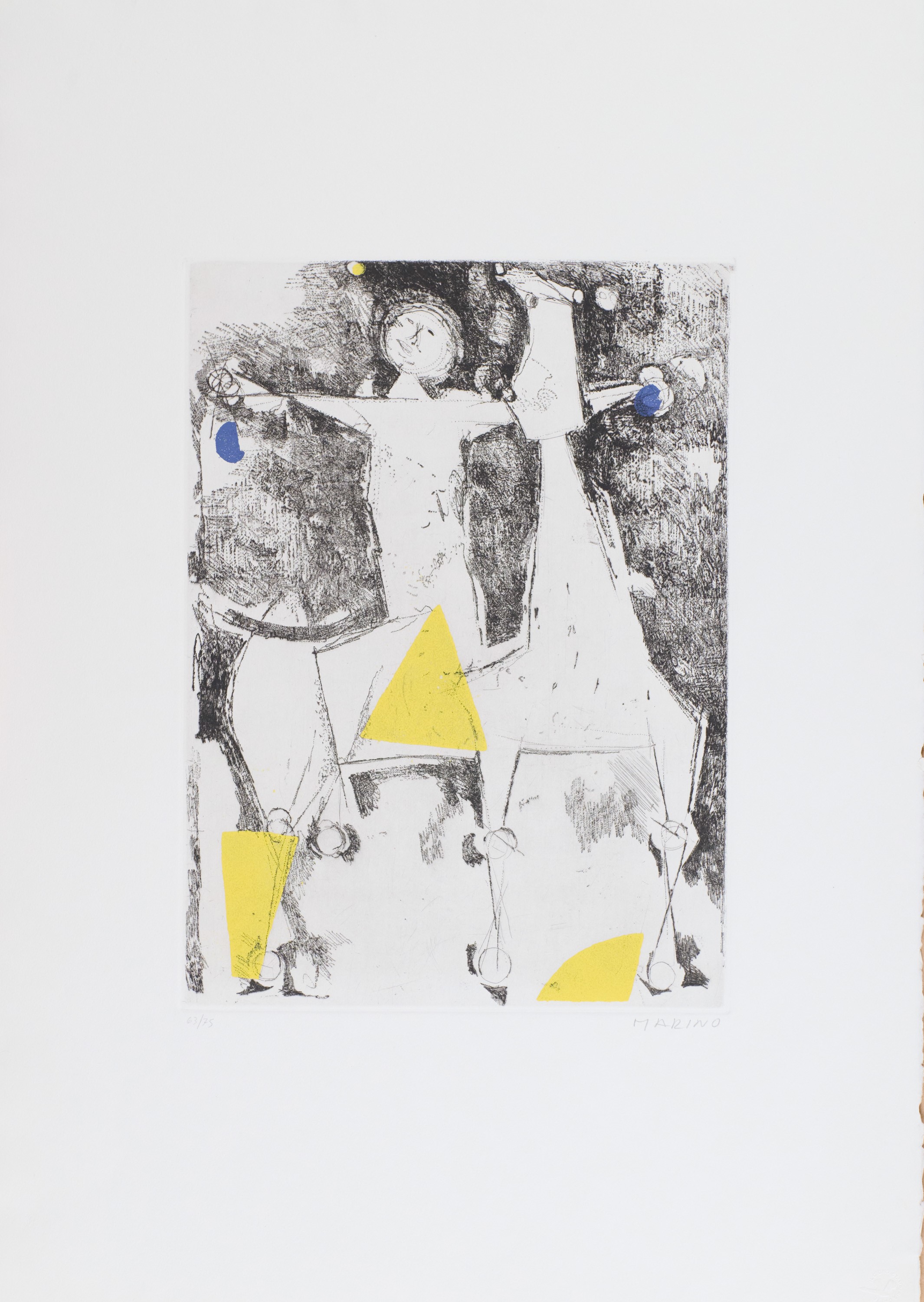 1) Gioco Perfetto, Puntasecca Acquatinta a 4 colori, Lastra cm 32x39. Firma e numerazione "Marino 63/75". Timbro a secco dello stampatore "Il cigno stamperia d'arte".