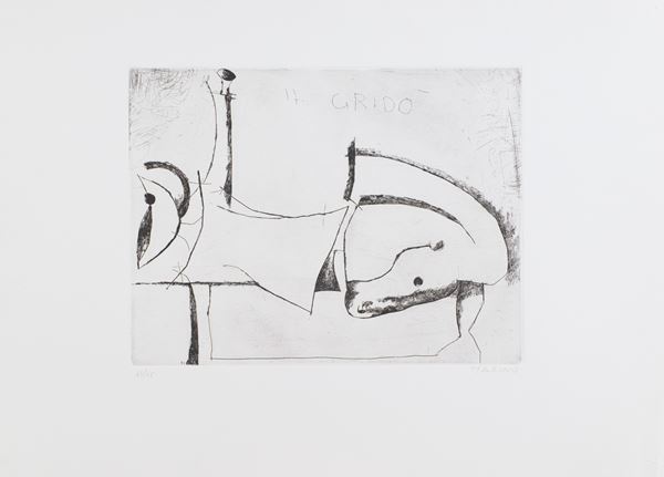 6) Il Grido, Puntasecca, lastra cm 39,5x30. Firma e numerazione "Marino 63/75". Timbro a secco dello stampatore "Il cigno stamperia d'arte".
