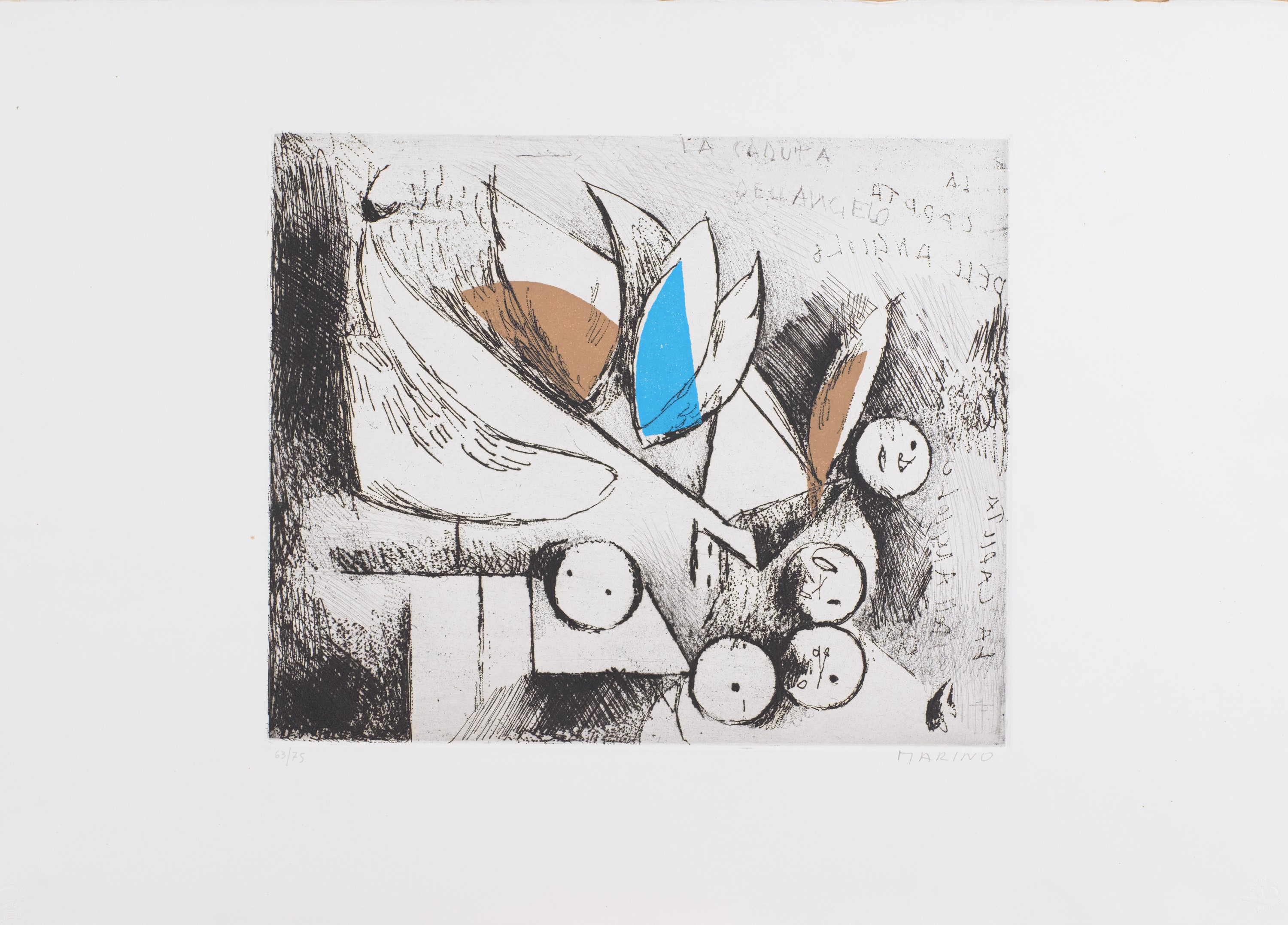 3) La caduta dell'angelo, Puntasecca Acquaforte e Acquatinta a 2 colori, Lastra cm 40x33. Firma e numerazione "Marino 63/75". Timbro a secco dello stampatore "Il cigno stamperia d'arte".