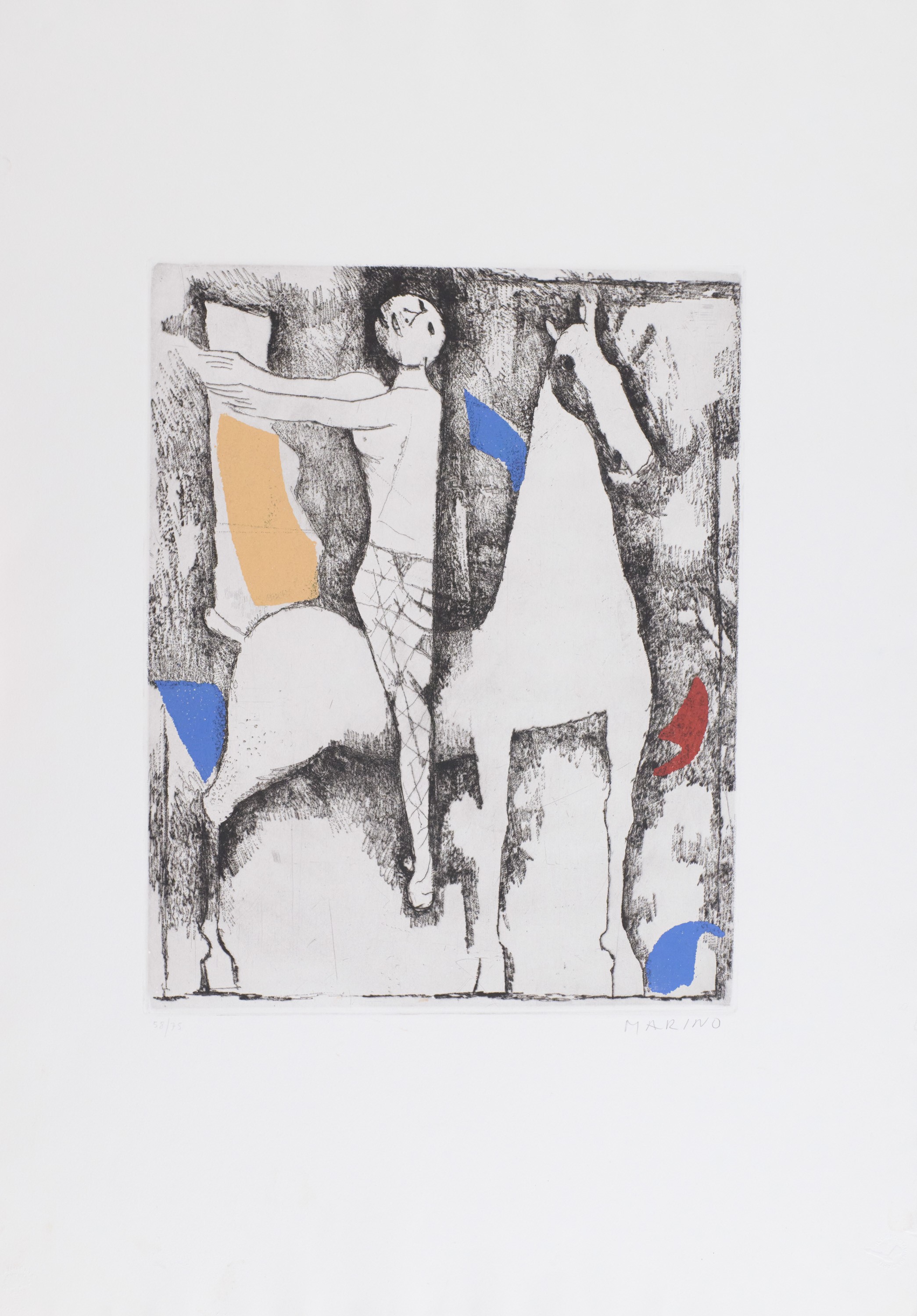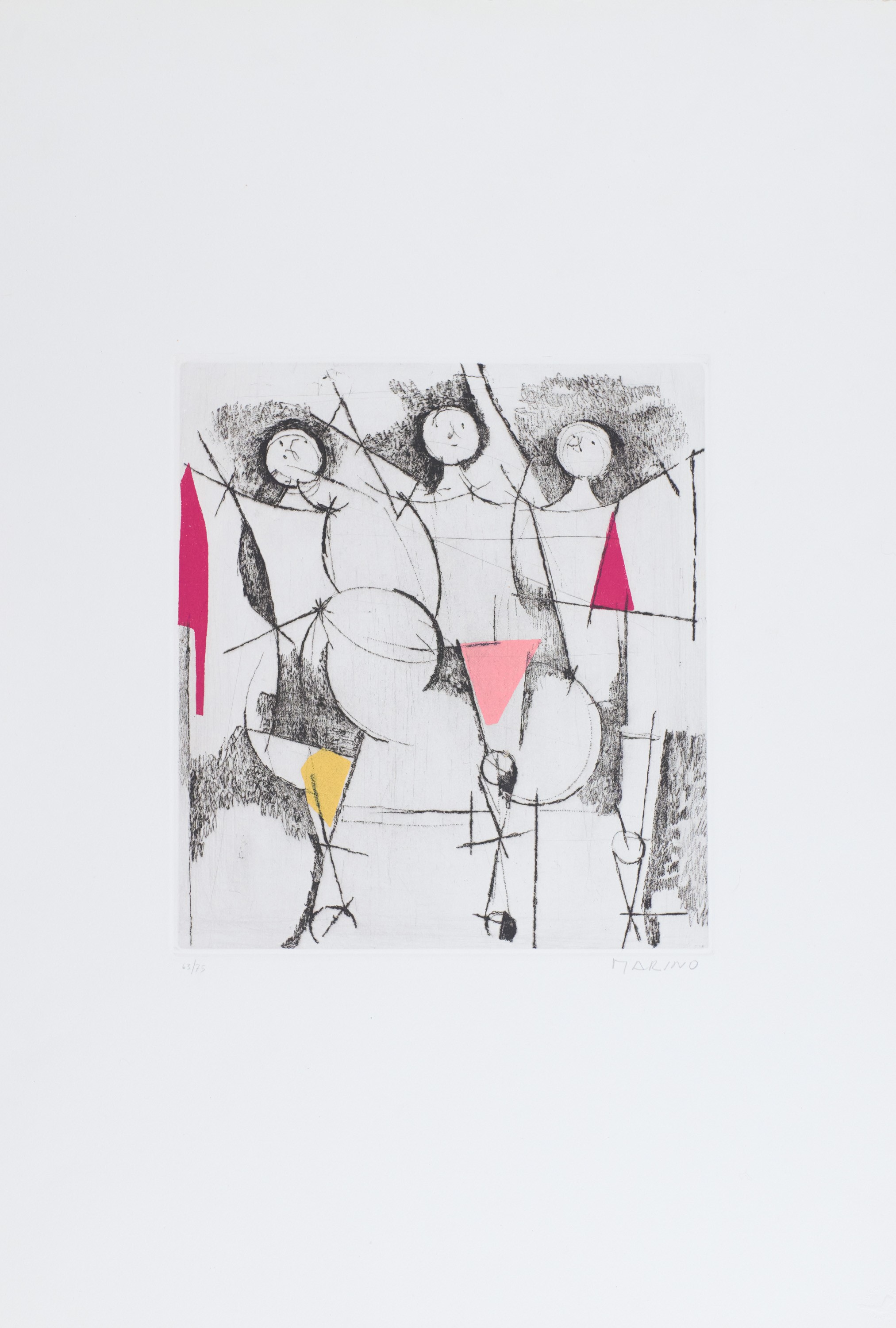 9) I Giochi, Puntasecca Acquatinta a 3 colori, Lastra cm 29x31. Firma e numerazione "Marino 63/75". Timbro a secco dello stampatore "Il cigno stamperia d'arte".