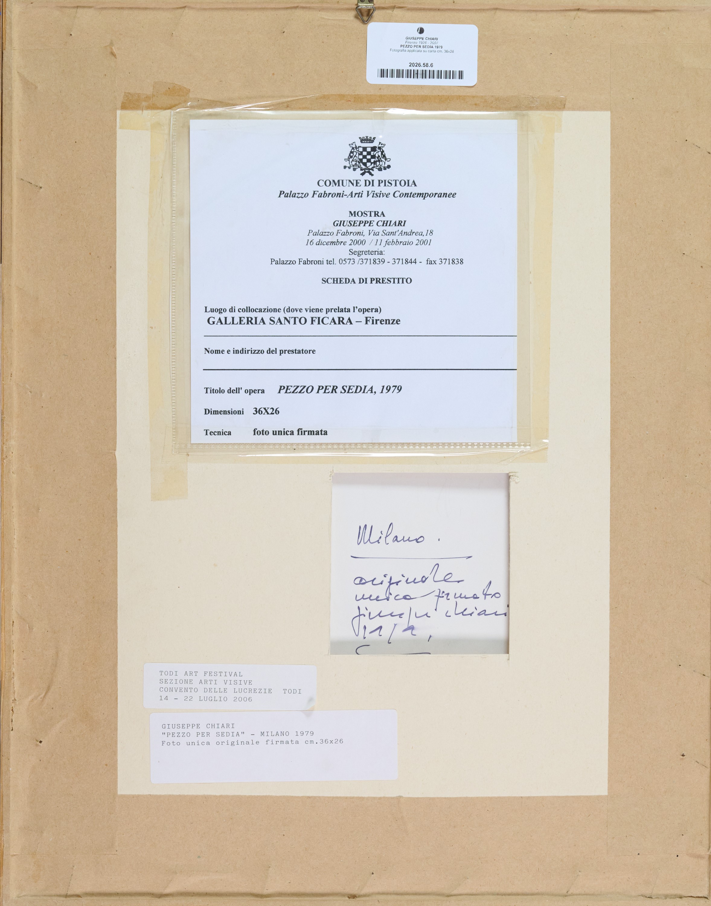 Sul verso: firma, descrizione ed etichetta "Todi Art Festival - Sezioni Arti Visive", Convento delle Lucrezie, Todi, 14 - 22 luglio 2006.