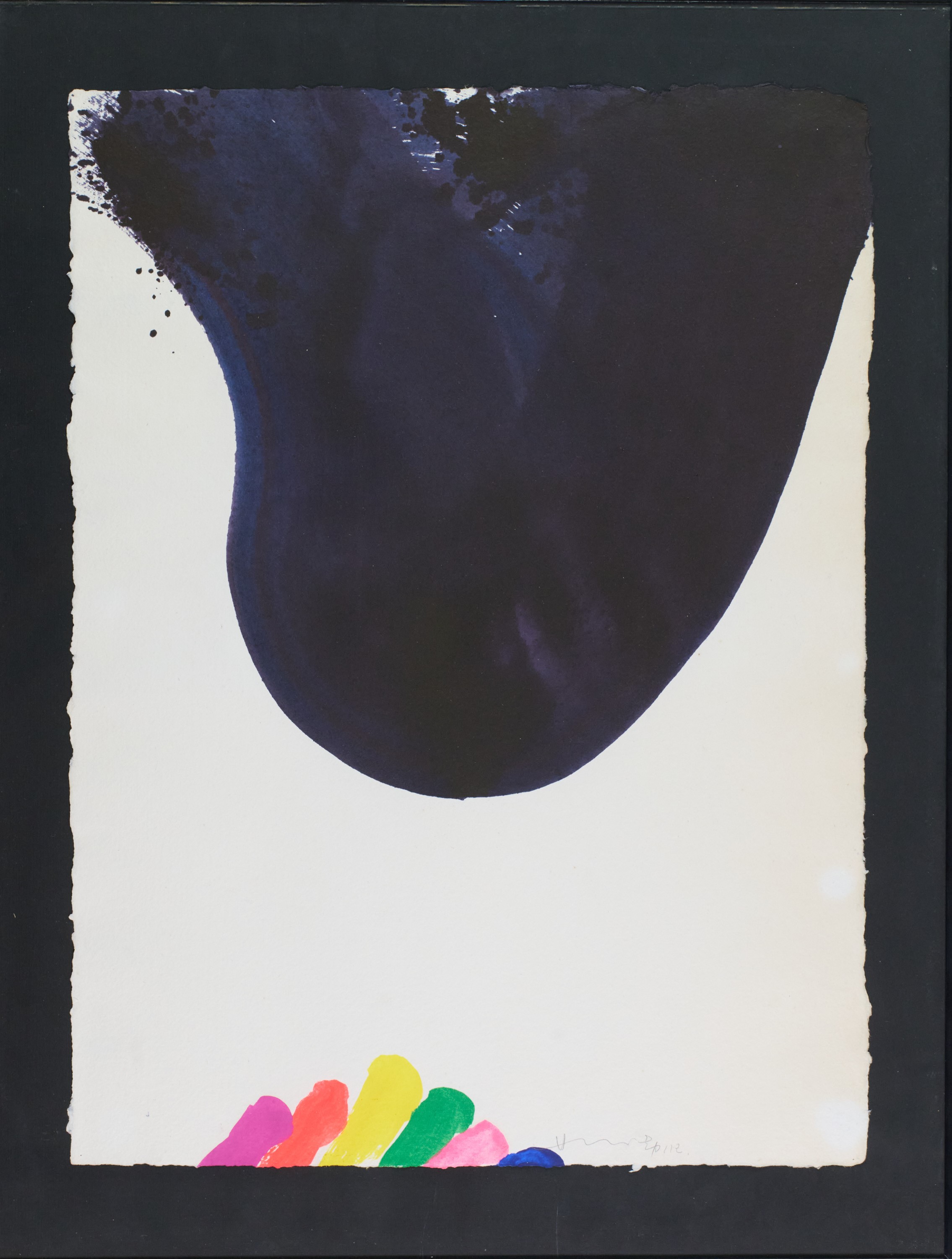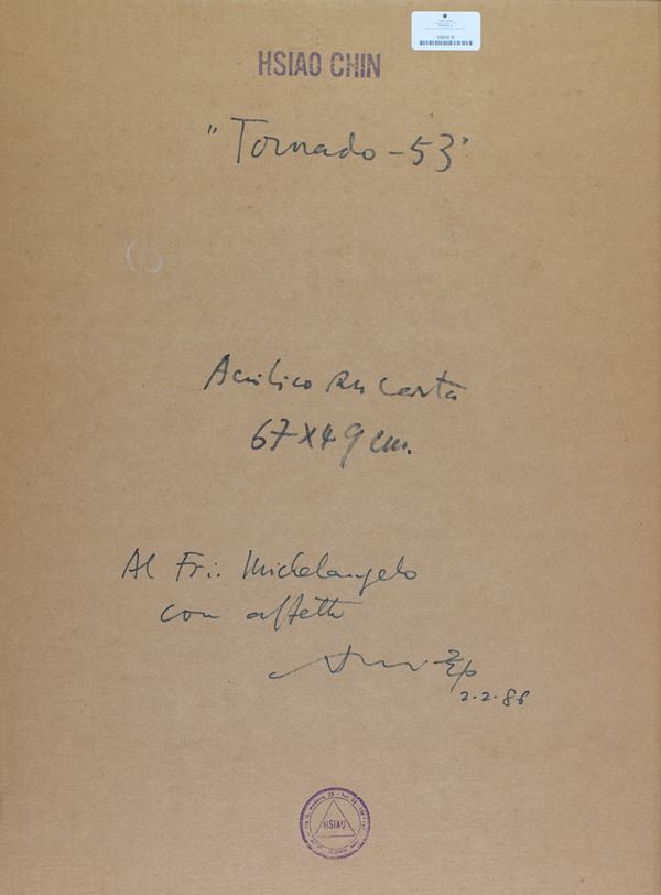 Sul verso del cartone di supporto: firma, timbro dell'Artista e dedica a persona con firma dell'Artista, data 2/2/1986